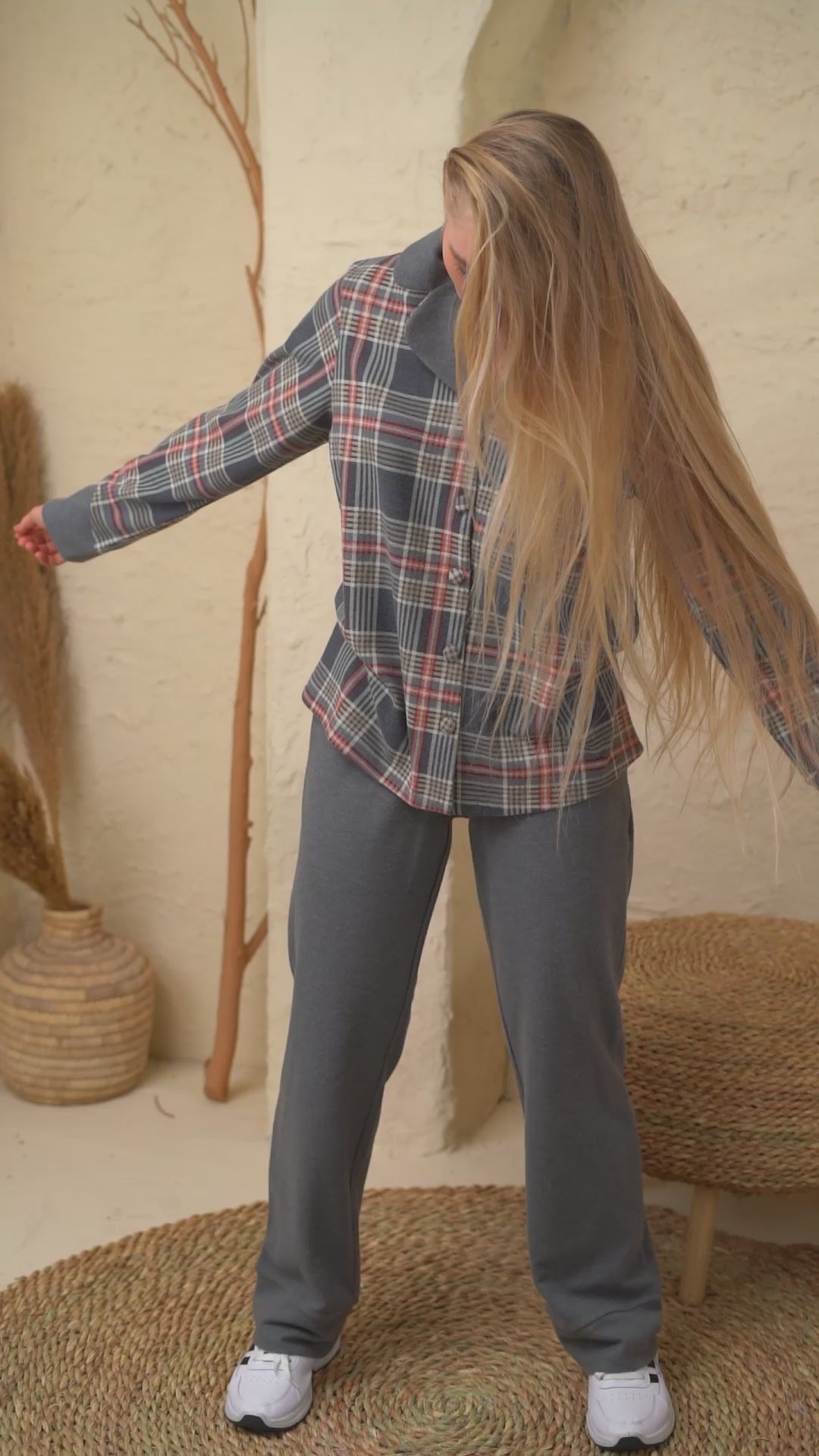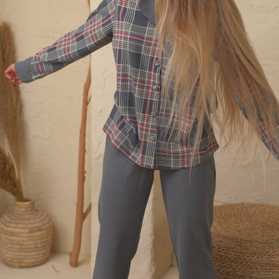 Stay warm and stylish this winter with this elegant pajama set. The model features a classic collared top with front buttons, crafted from soft jacquard fabric in a tasteful grey checkered pattern with subtle beige and red tones. The cuffs are finished in solid grey for a refined touch. The pants come in a matching plain grey design with an elastic waistband for maximum comfort and ease of movement. This set offers the perfect blend of cozy warmth and effortless style — ideal for lounging during the colder months.