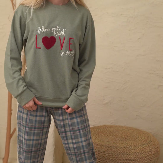 Feel cozy and stylish with the Love Touch Pajama crafted from premium jacquard fabric. The chic top with LOVE embroidery adds a feminine modern flair, while the plaid pants bring a classic and practical touch. A perfect choice that blends comfort and elegance effortlessly.