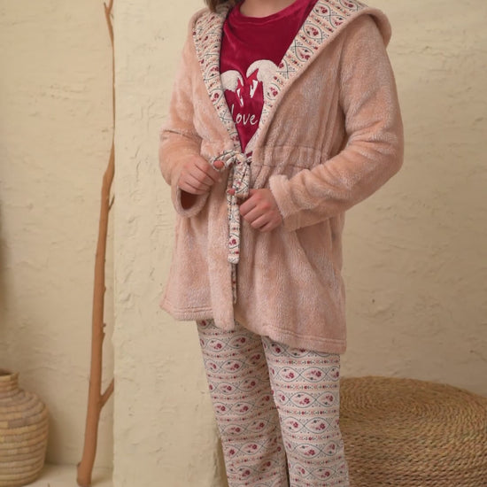 Embrace warmth and elegance with this chic winter set. A luxurious velvet top in a rich, romantic shade pairs perfectly with a soft polar fleece jacket featuring delicate patterned details for a modern, stylish look. The comfy printed pants complete the outfit, offering the ideal balance of comfort, warmth, and charm for cozy winter nights.