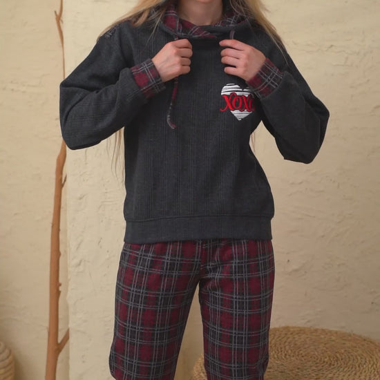 A two-piece winter pajama set made from high-quality jacquard fabric, soft and warm, perfect for cold winter days. The top features a practical hoodie design with drawstrings and a stylish embroidered heart with XOXO for a trendy touch. The pants come in a classic plaid pattern in red, gray, and black with an elastic waistband for added comfort and ease of movement. A perfect blend of warmth, coziness, and style for relaxing at home during the winter season.